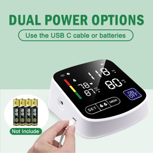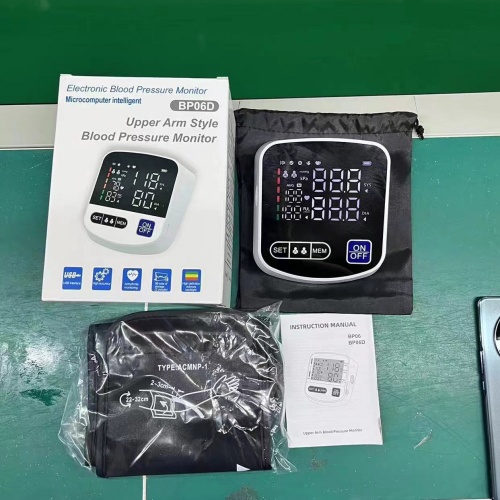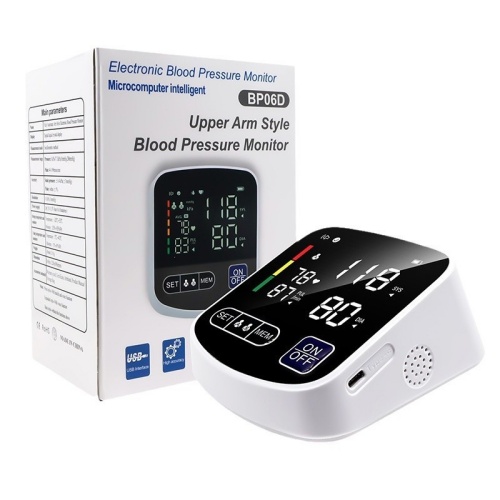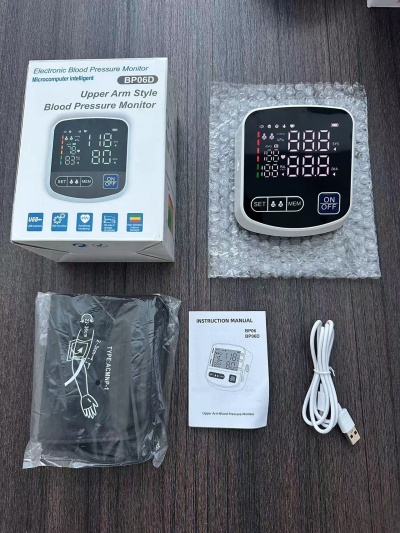 The BP06D electronic blood pressure monitor features a large, full-screen LED display for clear and easy readings. It employs fully automatic intelligent inflation technology, allowing for one-button blood pressure measurement.