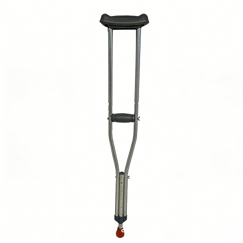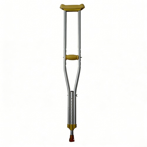 Adjustable aluminum alloy axillary crutches with nine height adjustment levels and a ball-bearing positioning structure for stability and durability. Suitable for postoperative rehabilitation and mobility assistance.